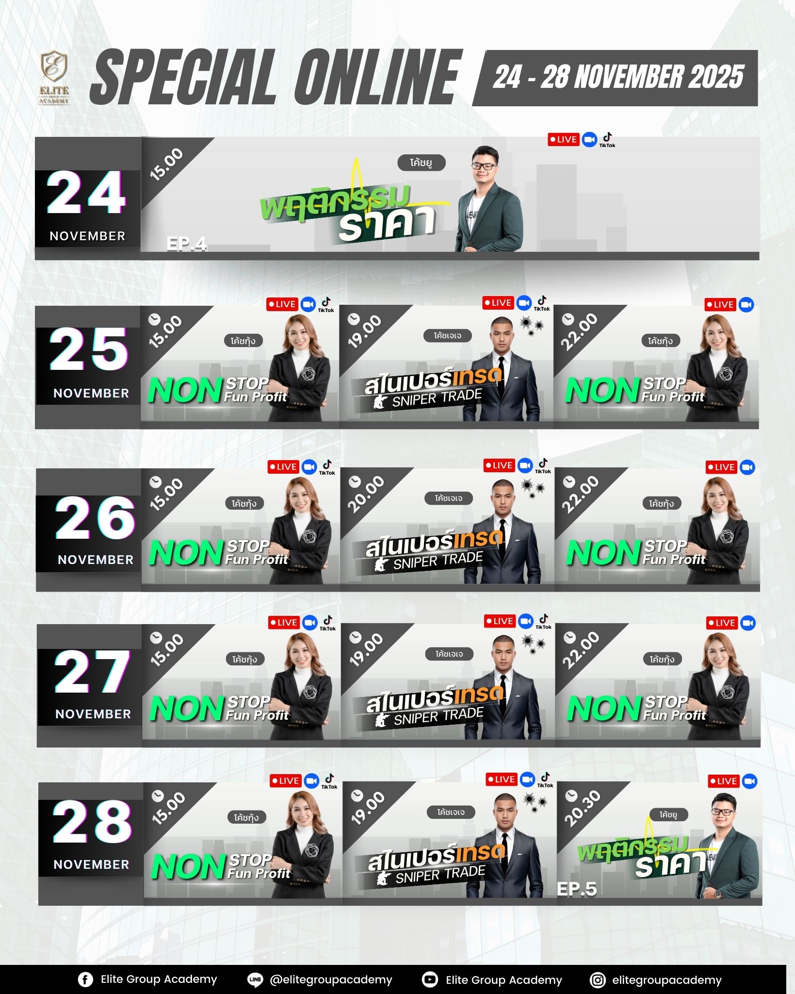 Elite Group Academy คือที่เรียนสอนเทรด Forex จากผู้เชี่ยวชาญด้านการเงินและการลงทุนในตลาดอัตราแลกเปลี่ยนเงินตราและทองคำ ซึ่งก่อตั้งขึ้นเพื่อเผยแพร่ความรู้ รวมกลุ่มเทรด และอัพเดทข่าวสาร บทวิเคราะห์ ทุกๆ ความเคลื่อนไหวในตลาด Forex และ ทองคำ ด้วยเครื่องมือและเทคนิคที่พิสูจน์ได้